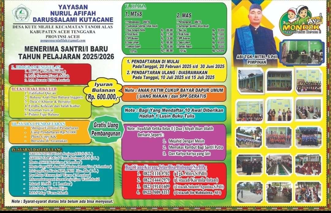Bagi Anda yang sedang mencari pondok pesantren yang mampu mengakomodasi pendidikan agama dan keterampilan, Pondok Pesantren Nurul Afifah adalah pilihan tepat. Mari bergabung bersama kami dan jadilah bagian dari generasi Islam yang cemerlang!