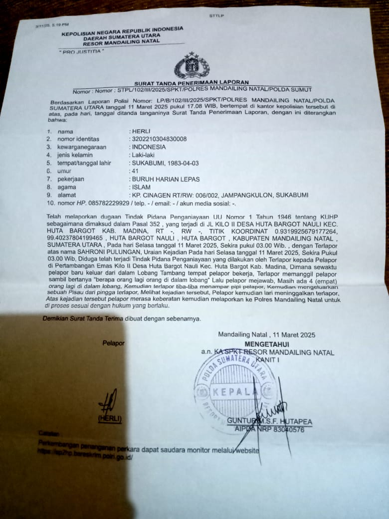 “Kami mendesak Polres Mandailing Natal untuk segera menangkap pelaku penganiayaan dan menelusuri keterkaitan kasus ini dengan jaringan mafia tambang. Jika benar ada aktor besar berinisial N yang mengendalikan PETI di wilayah ini, maka negara tidak boleh tunduk pada kekuatan mafia yang merusak lingkungan dan mengancam keselamatan masyarakat,” tegasnya.