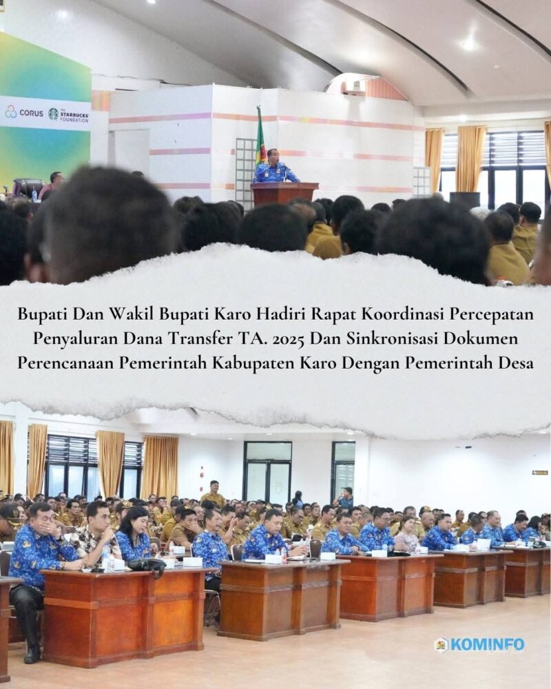 Karo | Waspada24.com – Bupati Karo, Brigjen Pol (Purn) Dr. dr. Antonius Ginting, Sp. OG, M. Kes Dan Wakil Bupati Karo, Komando Tarigan, SP hadiri Rapat Koordinasi Percepatan Penyaluran Dana Transfer TA. 2025 Dan Sinkronisasi Dokumen Perencanaan Pemerintah Kabupaten Karo Dengan Pemerintah Desa di Aula Kantor Bupati Karo , Jl. Letjen Jamin Ginting No.17 Kabanjahe, Kabupaten Karo. Jumat(25/04/25).