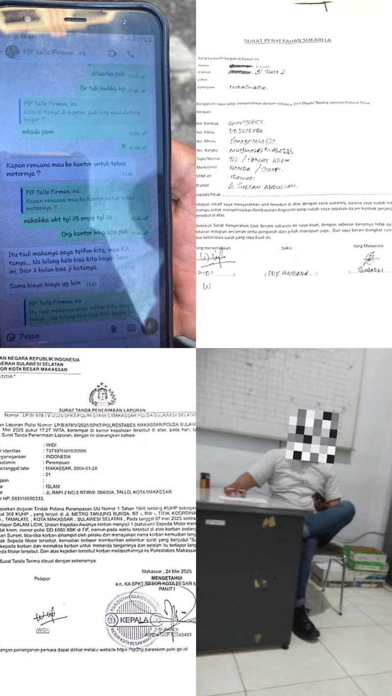 Pc meminta Irawati untuk membayar langsung tiga bulan jika ingin kendaraannya dikembalikan, dengan alasan “sistem dan prosedur.” Merasa dirugikan, Irawati melaporkan kejadian ini ke Polrestabes Makassar dengan nomor laporan LP/B/878/V/2025/SPKT/POLRESTABES MAKASSAR tertanggal 24 Mei 2025.