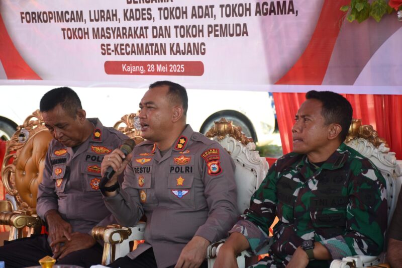 WASPADA24.COM, BULUKUMBA – Kapolres Bulukumba, AKBP Restu Wijayanto, S.I.K., bersama Dandim 1411/Blk, Letkol Inf. Sarman, S.Hub.Int, melaksanakan kegiatan silaturahmi bersama Forkopimca, para lurah dan kepala Desa, tokoh adat, tokoh agama, tokoh masyarakat, serta tokoh pemuda se-Kecamatan Kajang. Kegiatan ini berlangsung di halaman Kantor Polsek Kajang, Rabu (28/5/2025).