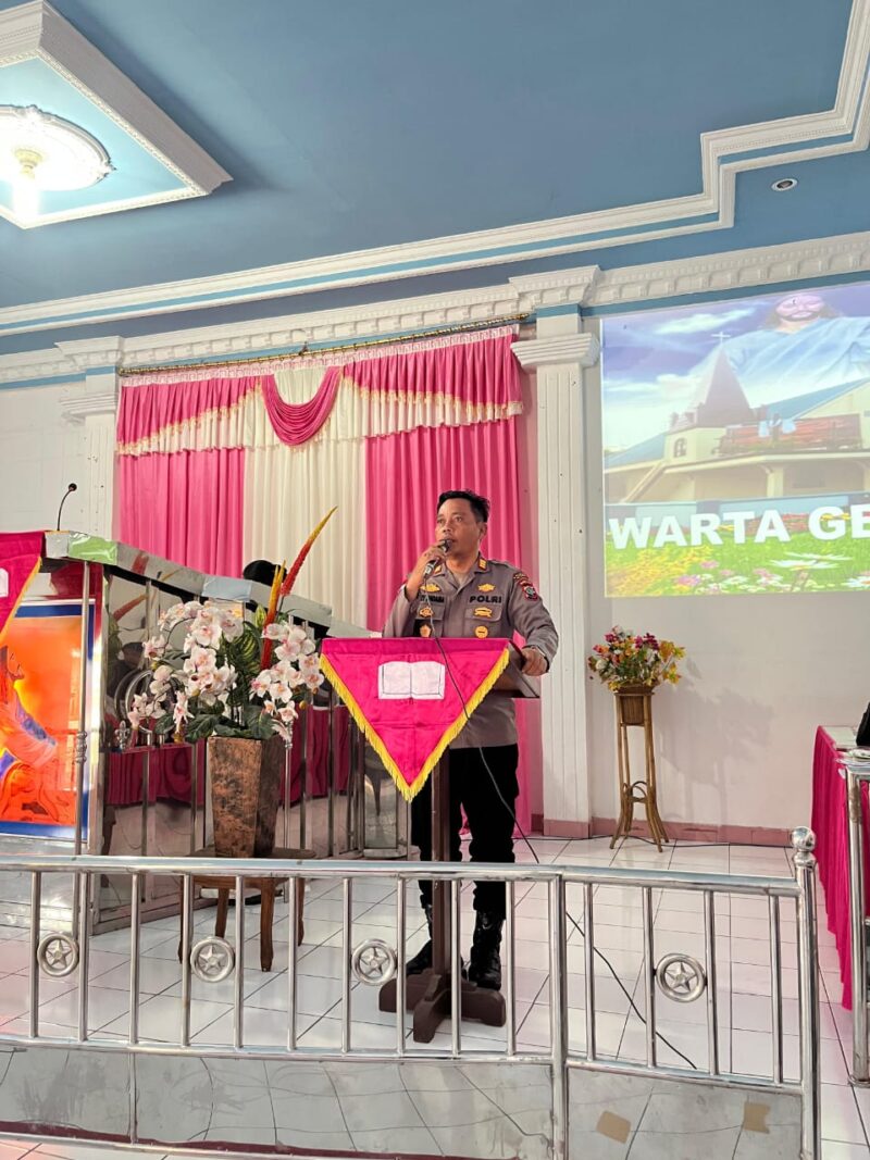 AKP Ferry Padama dalam sambutannya menyampaikan pesan-pesan Kamtibmas kepada jemaat, menekankan bahwa kehadirannya bukan hanya menjalankan tugas, tapi juga wujud kepedulian dan komitmen Polri dalam menjalin sinergitas, solidaritas, dan menjaga stabilitas keamanan bersama masyarakat.