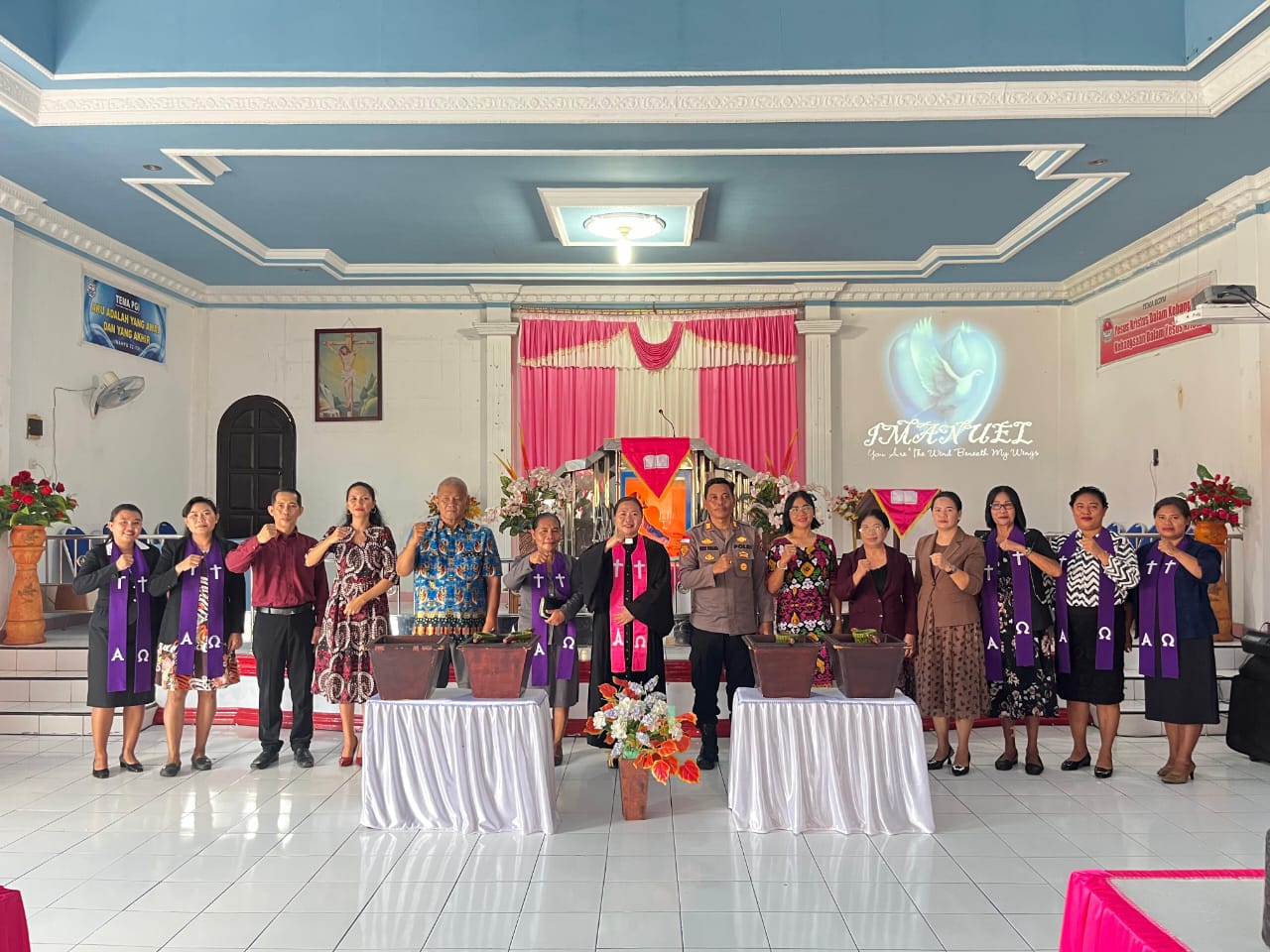 Para pemimpin gereja, termasuk Ketua Pimpinan Majelis Sidang Gembala Devy Pesik, Ketua Badan Pimpinan Sidang Pnt. Robby Wulur, ST, dan Ibu Gembala Siska Yunita Kansil-Lambey, menyambut hangat kehadiran Kapolsek Maesa dalam ibadah Minggu Kasih, yang mereka pimpin dengan khotbah bertema “Rasul Menanti-Menanti” (Kisah Para Rasul 1:12-14).