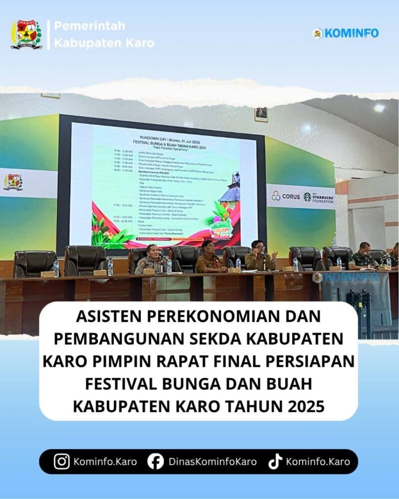 Karo | Waspada24.com – Asisten Perekonomian dan Pembangunan Sekda Kabupaten Karo, Drs. Dapatkita Sinulingga, hadiri Rapat Final Persiapan Festival Bunga dan Buah Kabupaten Karo 2025 yang digelar pada Senin, 28 Juli 2025 di Aula Kantor Bupati Karo. Rapat ini dihadiri oleh FORKOPIMDA Kabupaten Karo, Dinas terkait, PKK, Dharma Wanita dan Perwakilan dari Camat se-Kabupaten Karo .