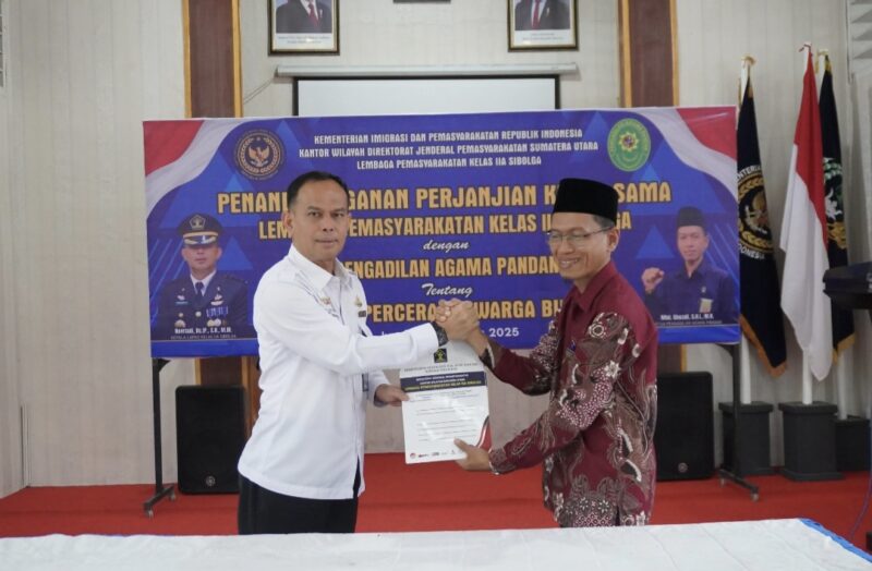 Sibolga – Dalam upaya menjamin terpenuhinya hak-hak warga binaan, Lembaga Pemasyarakatan Kelas IIA Sibolga menjalin kerja sama dengan Pengadilan Agama Pandan melalui penandatanganan perjanjian kerja sama yang dilaksanakan di Aula Sahardjo Lapas Sibolga, Jumat (01/08/2025).