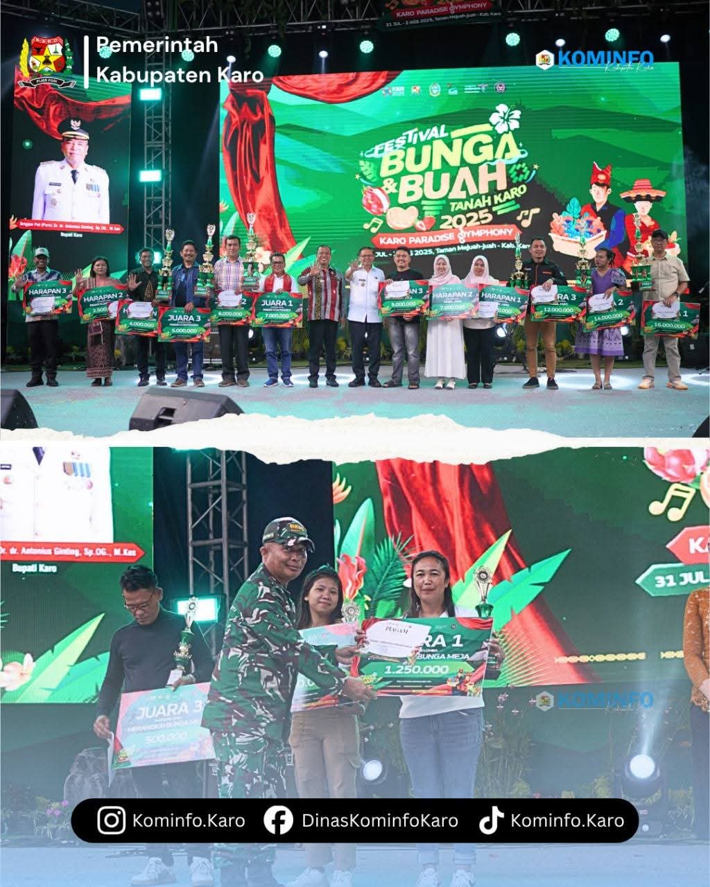 BERASTAGI | Waspada24.com – Bupati Karo, Brigjen Pol (Purn) Dr.dr. Antonius Ginting, Sp.OG,M. Kes., didampingi oleh Wakil Bupati Karo, Komando Tarigan, S.P., Anggota DPD RI Badikenita Br Sitepu, Wakil Ketua DPRD Imanuel Sembiring, Waka Polres Tanah Karo Kompol Zulham, dan Perwakilan Dandim 0205/TK Kapt. Inf. Vincent Bangun, menyerahkan Hadiah Kepada Para Peraih Juara Lomba di Festival Bunga dan Buah Kabupaten Karo 2025 pada Hari ke-3, Sabtu (2/8/2025).