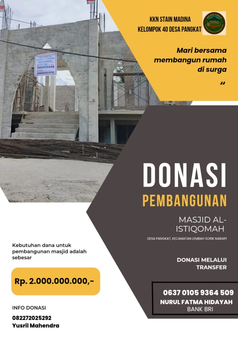 Kepala Desa Pangkat “Lokot Lubis” Saya sangat mengapresiasi kebersamaan Naposo Nauli Bulung dan adik-adik KKN STAIN Madina Kelompok 40 yang telah bergotong royong membantu pembangunan Masjid Al-Istiqomah dan selama Kegiatan pengambilan bambu untuk pembangunan masjid tersebut berhasil mengumpulkan sebanyak 150 batang bambu sebagaimana yang dibutuhkan dalam pembangunan Masjid,dalam kegiatan ini mencerminkan semangat gotong royong dan kepedulian terhadap fasilitas ibadah desa kita. Semoga menjadi amal jariyah dan memupuk rasa kebersamaan yang semakin kuat di tengah masyarakat.