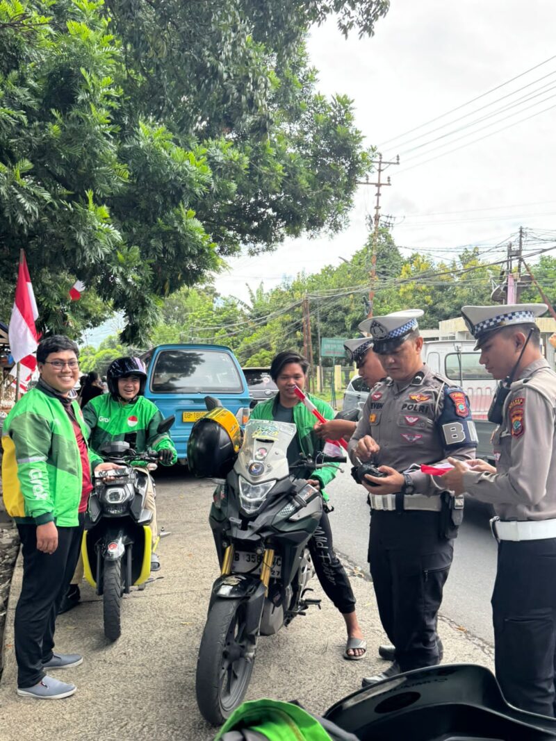 Tak hanya pengendara roda dua dan empat, bendera juga dibagikan kepada pengemudi ojek online, pangkalan ojek, hingga pelajar yang melintas.