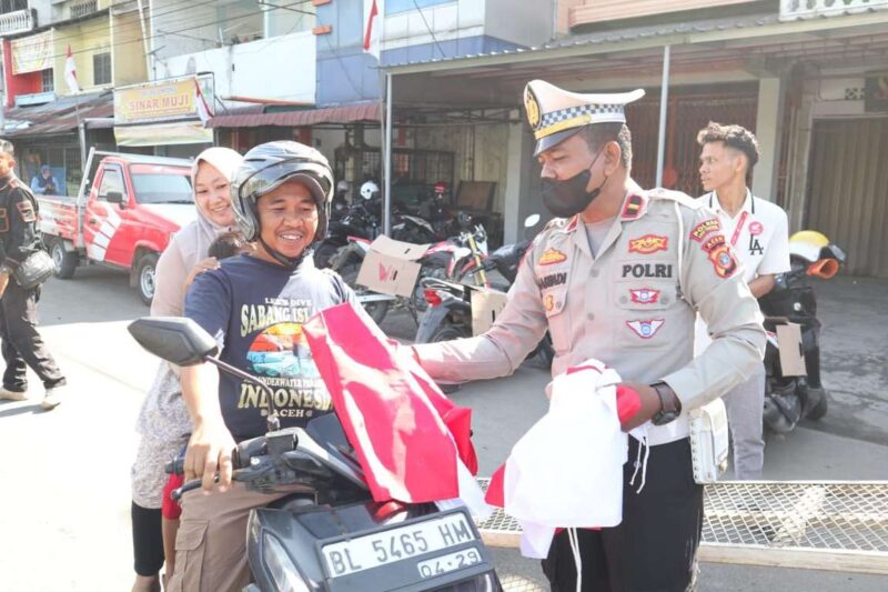 Kutacane – Menyambut Hari Ulang Tahun (HUT) Republik Indonesia ke-80, Polres Aceh Tenggara bekerja sama dengan Forum Komunikasi Pimpinan Daerah (Forkopimda) menggelar kegiatan pembagian bendera merah putih kepada para pengendara yang melintas di kawasan Lapangan Ahmad Yani, Kutacane, Kamis (14/8/2025). Kegiatan ini menjadi salah satu upaya nyata untuk menumbuhkan rasa nasionalisme dan cinta tanah air di tengah masyarakat.