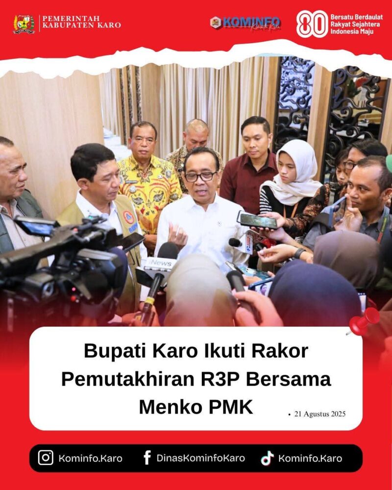 Jakarta | Waspada24.com – Bupati Karo, Brigjen Pol (Purn) Dr. dr. Antonius Ginting, Sp.OG, M.Kes menghadiri Rapat Koordinasi Penanganan Bencana Erupsi Gunung Lewotobi Flores Timur serta Pemutakhiran Rencana Rehabilitasi dan Rekonstruksi Pasca Bencana (R3P), yang berlangsung di Kantor Kemenko PMK, Kamis (21/8/2025).
