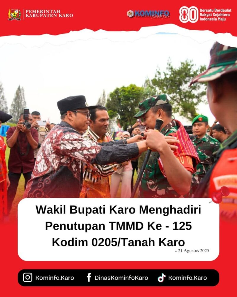 Berastagi | Waspada24.com – Wakil Bupati Karo Komando Tarigan, S.P didampingi oleh Sekda Karo Dr. Drs Eddi Surianta Surbakti, Mpd, menghadiri Penutupan TMMD Ke – 125 Kodim 0205/Tanah Karo yang dilaksanakan pada tanggal 21 Agustus 2025 di Lapangan Mickey Holiday. Upacara penutupan ini turut dihadiri oleh Forkompimda Kabupaten Karo dan masyarakat setempat.