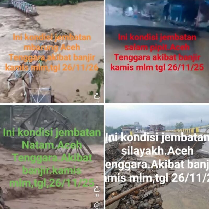 Disaat dikonfirmasi lewat telepon gegam Kabid Rehabilitasi dan Rekonstruksi Badan Penanggulangan Bencana Daerah (BPBD), Dodi Sukmariga Tajmal,” dia mengatakan pada waspada24.com Kamis,27/11/25 untuk sementara ini, jembatan rangka baja yang putus antara lain jembatan.Natam Kecamatan Darulhasanah,mbarung di Kecamatan Babusalam, dan Jembatan Salim Pipit di Kecamatan Babul Rahmah,”jelasnya.