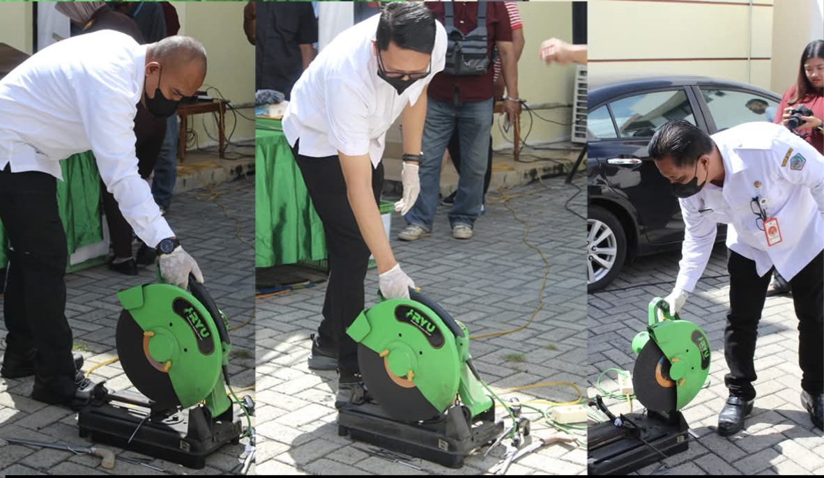 Sementara itu, barang bukti senjata tajam dipotong-potong menjadi beberapa bagian menggunakan mesin gerinda besi agar tidak dapat difungsikan kembali, sedangkan paket narkotika jenis sabu dan dokumen lainnya dimusnahkan dengan cara dibakar.