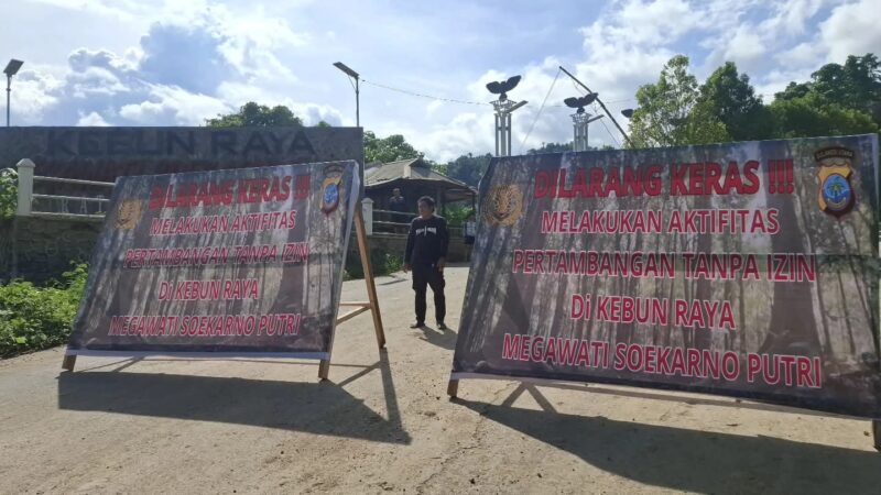 Akses masuk kawasan Kebun Raya Megawati Soekarnoputri, Ratatotok, kini dijaga ketat secara visual melalui pemasangan baliho larangan aktivitas pertambangan tanpa izin (PETI), Rabu (24/12/25).