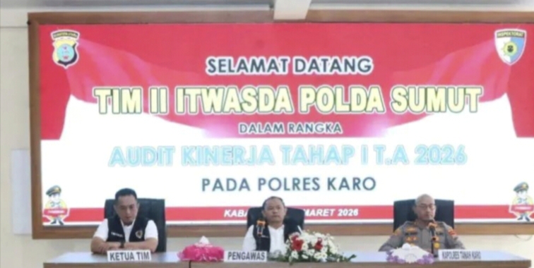 Karo | Waspada24.com – Polres Tanah Karo menerima kunjungan Tim Inspektorat Pengawasan Daerah (Itwasda) Polda Sumatera Utara untuk pelaksanaan Audit Kinerja Tahap I Aspek Perencanaan Tahun 2026. Kegiatan tersebut dilaksanakan pada Jumat (12/03/2026) pukul 09.00 WIB di Aula Pur Pur Sage Mapolres Tanah Karo.