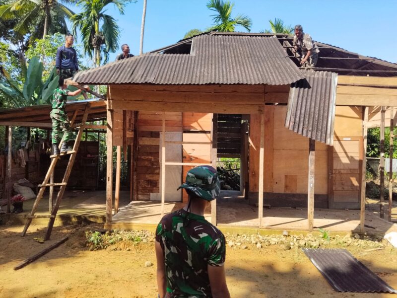 Personel Satgas bersama warga setempat bergotong royong membongkar bagian rumah yang sudah lapuk untuk segera direhabilitasi menjadi tempat tinggal yang lebih layak dan aman.